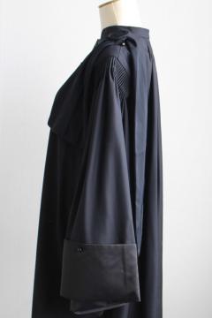 Des bandes de tissu en satin noir terminent les manches. La toge se ferme à l'aide de boutons noirs polis et est finie par un col Mao.